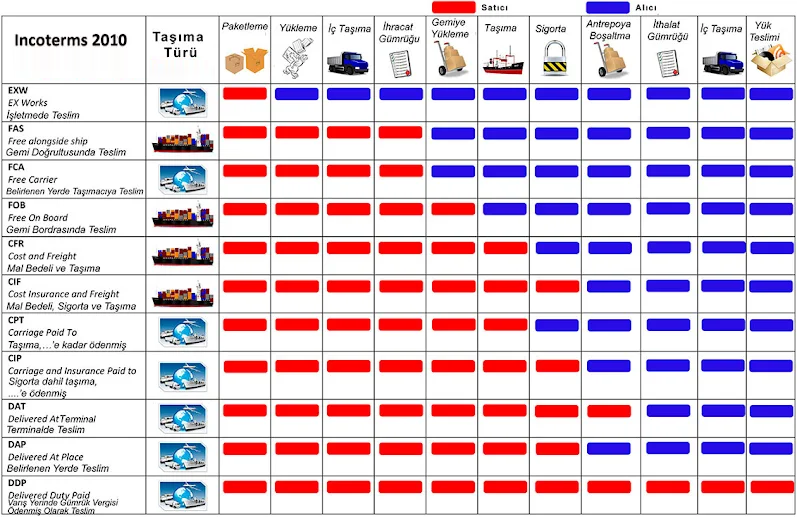 - Satıcı ve alıcı arasındaki teslimat, taşıma, sigorta, masraf ve risk paylaşımını standartlaştıran,